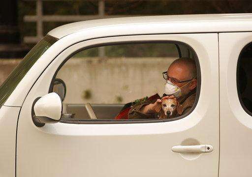 Chris Shiery pets his dog, Ruby, while waiting to evacuate the town of Sonoma, Calif., Wednesday, Oct. 11, 2017. With fires getting near, the town was placed under a voluntary evacuation order. (AP Photo/Rich Pedroncelli)
