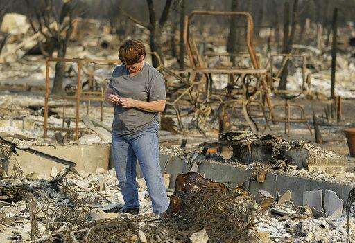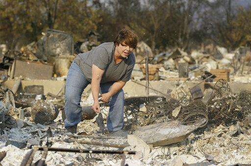 Tammy Christiansen searches the remains of her Coffey Park neighborhood home Wednesday, Oct. 11, 2017, in Santa Rosa, Calif. During her search she found her wedding ring and her son's wrestling trophy. Officials say they have thousands of firefighters battling 22 blazes burning in Northern California and that more are coming from nearby states. (AP Photo/Eric Risberg)