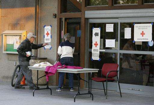 A couple makes their way into a Red Cross disaster relief center Wednesday, Oct. 11, 2017, in Santa Rosa, Calif. Three days after the fires began, firefighters were still unable to gain control of the blazes that had turned entire Northern California neighborhoods to ash and destroyed thousands of homes and businesses. (AP Photo/Eric Risberg)