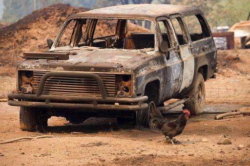 A rooster walks by one of several burned out vehicles after a wildfire destroyed a home and farm on Wednesday, Oct. 11, 2017, in Calistoga, Calif. Three days after the fires began, firefighters were still unable to gain control of the blazes that had turned entire Northern California neighborhoods to ash and destroyed thousands of homes and businesses. (Paul Kitagaki Jr./The Sacramento Bee via AP)