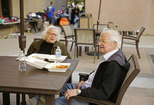 Jim Merriman, right, and his wife Lu, have a meal while spending the evening at a Red Cross disaster relief center Wednesday, Oct. 11, 2017, in Santa Rosa, Calif. The couple had to evacuate from their home in the Mendocino Woods neighborhood of Santa Rosa. Three days after the fires began, firefighters were still unable to gain control of the blazes that had turned entire Northern California neighborhoods to ash and destroyed thousands of homes and businesses. (AP Photo/Eric Risberg)