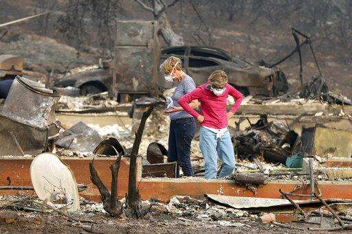 Two women, sort through the rubble of the property on 106 West Gate Drive in Napa, Calif., on Wednesday, Oct. 11, 2017. The property is where an elderly couple, died during the fire last Sunday, Oct. 8, 2017. (Ray Chavez /San Jose Mercury News via AP)
