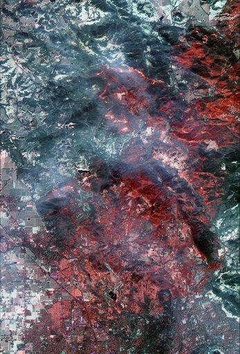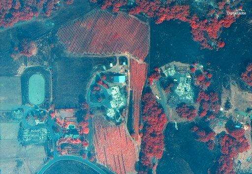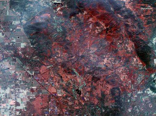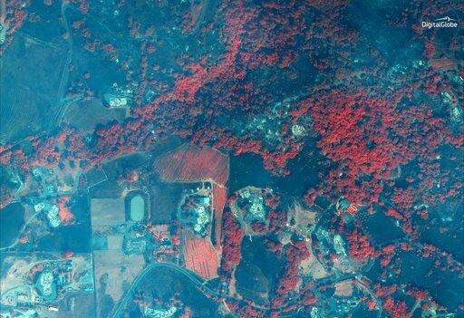 This Wednesday, Oct. 11, 2017 satellite image using a Very Near Infrared (VNIR) provided by DigitalGlobe shows damage from the wildfire near Santa Rosa, Calif. VNIR imagery causes healthy vegetation to appear red and the burn scar from the wildfire to be dark brown. Wildfires whipped by powerful winds swept through Northern California sending residents on a headlong flight to safety through smoke and flames as homes burned. (Digital Globe via AP)