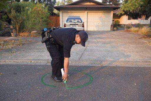 Oakland Police officer Anh Nguyen spray paints the street to mark that a house in Calistoga, Calif., is vacant on Wednesday, Oct. 11, 2017. The entire historic town of Calistoga, population 5,000, was evacuated. Three days after the fires began, firefighters were still unable to gain control of the blazes that had turned entire Northern California neighborhoods to ash and destroyed thousands of homes and businesses. (Paul Kitagaki Jr./The Sacramento Bee via AP)