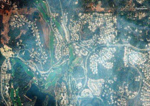 This Wednesday, Oct. 11, 2017, satellite image provided by DigitalGlobe shows damage from the wildfire and Fountaingrove Golf & Athletic Club in Santa Rosa, Calif. Wildfires whipped by powerful winds swept through Northern California sending residents on a headlong flight to safety through smoke and flames as homes burned. (Digital Globe via AP)