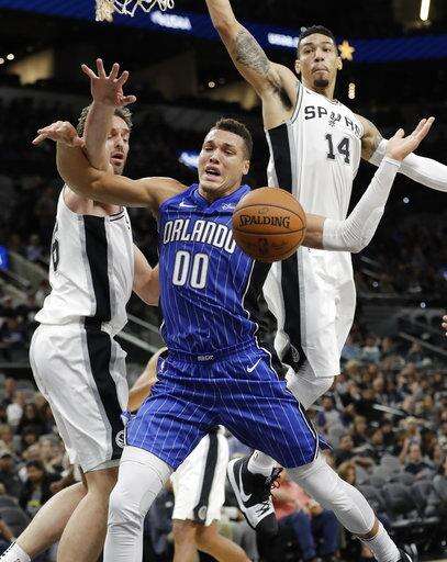Orlando Magic forward Aaron Gordon (00) loses control of the ball as he is defended by San Antonio Spurs forward Pau Gasol (16) and guard Danny Green (14) during the first half of a preseason NBA basketball game, Tuesday, Oct. 10, 2017, in San Antonio. (AP Photo/Eric Gay) The Associated Press