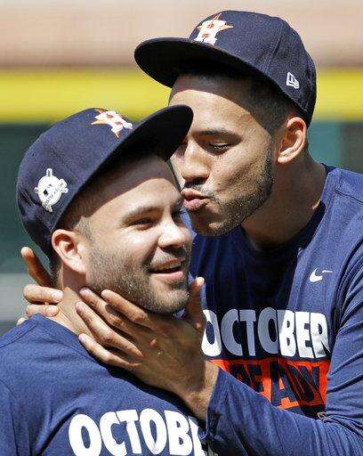 Houston Astros shortstop Carlos Correa, right, jokes with second baseman Jose Altuve during practice Wednesday, Oct. 11, 2017, in Houston. The Astros beat the Red Sox to advance to the ALCS which is set to begin Friday. (AP Photo/David J. Phillip) The Associated Press