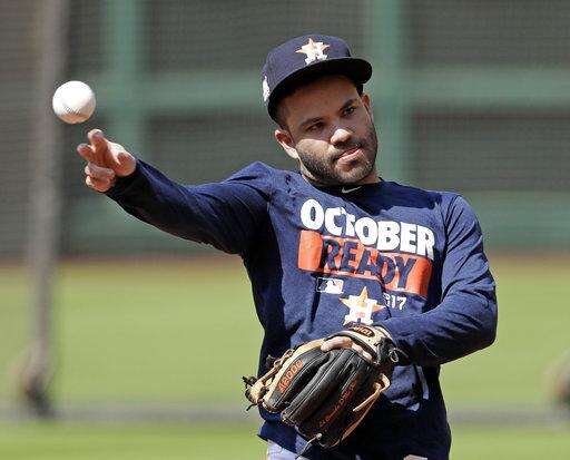 Houston Astros second baseman Jose Altuve asks for his glove during practice Wednesday, Oct. 11, 2017, in Houston. The Astros beat the Red Sox to advance to the ALCS which is set to begin Friday. (AP Photo/David J. Phillip) The Associated Press