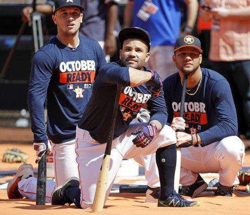 Houston Astros second baseman Jose Altuve, center, waits to bat with third baseman Alex Bregman, left, and first baseman Yuli Gurriel during baseball practice Wednesday, Oct. 11, 2017, in Houston. The Astros beat the Boston Red Sox to advance to the ALCS, which is set to begin Friday. (AP Photo/David J. Phillip) The Associated Press