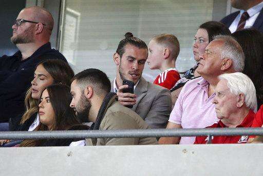 Wales' Gareth Bale in the stands during the World Cup 2018 Group D qualifying soccer match between Wales and Republic of Ireland at the Cardiff City Stadium, Cardiff, Wales, Monday, Oct. 9, 2017. (Nigel French/PA via AP) The Associated Press