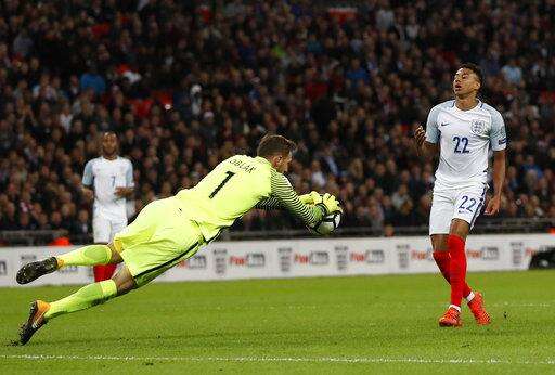 England's Jesse Lingard, right, reacts as Slovenia goalkeeper Jan Oblak dives for the ball during the World Cup Group F qualifying soccer match between England and Slovenia at Wembley stadium in London, Thursday, Oct. 5, 2017. (AP Photo/Kirsty Wigglesworth) The Associated Press