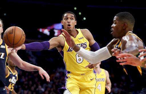 Los Angeles Lakers guard Jordan Clarkson, left, passes around Utah Jazz guard Joe Johnson during the second half of an NBA preseason basketball game in Los Angeles, Tuesday, Oct. 10, 2017. (AP Photo/Chris Carlson) The Associated Press