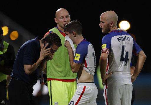 United States' Christian Pulisic, center, and his teammate United States' Michael Bradley, right, walk on the pitch after losing 2-1 against Trinidad and Tobago during a 2018 World Cup qualifying soccer match  in Couva, Trinidad, Tuesday, Oct. 10, 2017. (AP Photo/Rebecca Blackwell)