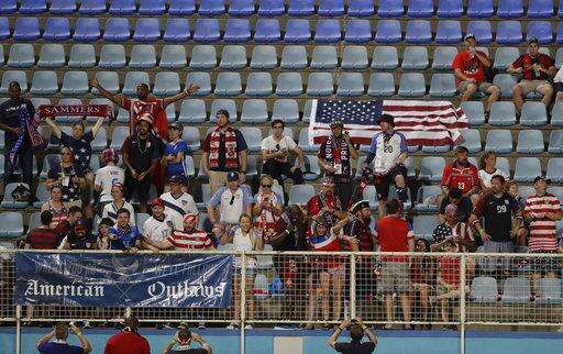 U.S. fans cheer during a 2018 World Cup qualifying soccer match against Trinidad and Tobago  in Couva, Trinidad, Tuesday, Oct. 10, 2017. (AP Photo/Rebecca Blackwell)