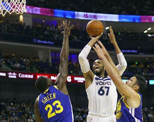 FILE - In this Oct. 8, 2017, file photo, Minnesota Timberwolves' Taj Gibson, center, shoots between Golden State Warriors' Draymond Green, left, and Zaza Pachulia during their preseason NBA game in Shanghai, China. After a disappointing first season in Minnesota, Tom Thibodeau went to some old friends from Chicago for help. Jimmy Butler, Taj Gibson and Aaron Brooks come aboard to help the young Timberwolves get on the same page with their demanding coach. (AP Photo/File) The Associated Press