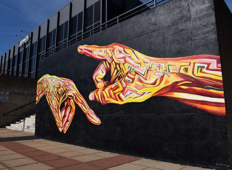 Artist Joanna White created this mural titled "Which Way" on the south wall of the Hemmens Cultural Center in Elgin. She will be at Art Harvest Oct. 28 to talk about her piece with the public. Rick West/rwest@dailyherald.com