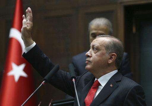 Turkey's President Recep Tayyip Erdogan gestures as he addresses the lawmakers of his ruling party in Ankara, Turkey, Tuesday, Oct. 24, 2017. Erdogan said an operation to implement a "de-escalation" zone in Syria's northern Idlib province is "to a great extent complete." Erdogan suggested that Turkish troops could now target Syria's border region of Afrin, which is controlled by Syrian Kurdish groups. (Presidential Press Service, pool photo via AP) The Associated Press