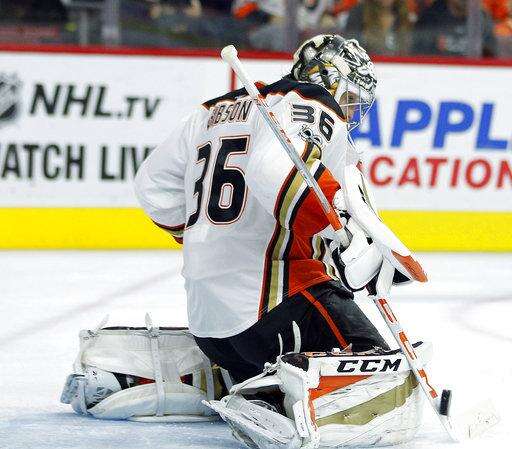 Anaheim Ducks' John Gibson deflects a shot on goal during the second period of an NHL hockey game against the Philadelphia Flyers, Tuesday, Oct. 24, 2017, in Philadelphia. (AP Photo/Tom Mihalek) The Associated Press