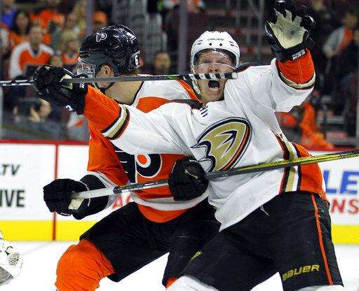 Anaheim Ducks' Ondrej Kase, right, reacts after scoring a goal during the first period of an NHL hockey game against the Philadelphia Flyers, Tuesday, Oct. 24, 2017, in Philadelphia. Behind Kase is Flyers' defenseman Travis Sanheim. (AP Photo/Tom Mihalek) The Associated Press