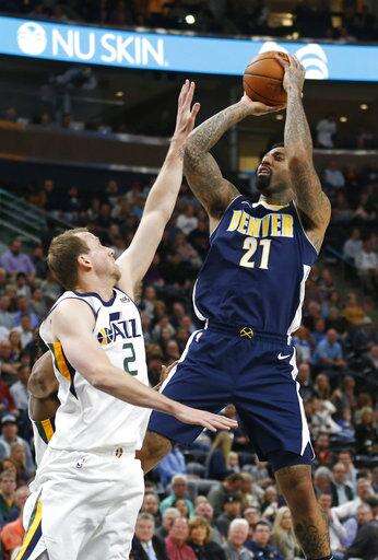 Denver Nuggets forward Wilson Chandler (21) shoots as Utah Jazz forward Joe Ingles (2) defends during the first half of an NBA basketball game Wednesday, Oct. 18, 2017, in Salt Lake City. (AP Photo/Rick Bowmer)