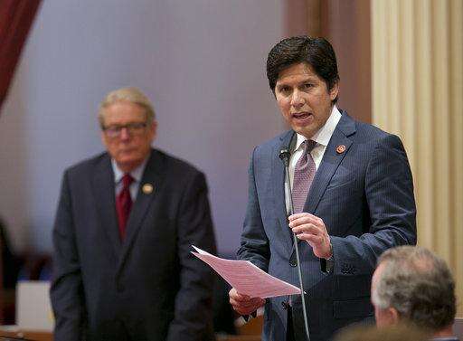 FILE - In this Sept. 15, 2017, file photo, state Senate President Pro Tem Kevin de Leon, D-Los Angeles, right, speaks at the Capitol in Sacramento, Calif. In the wake of allegations of sexual harassment at the state Capitol, de Leon announced, Monday, Oct. 23, 2017, the Senate will hire two outside firms to investigate allegations of sexual assault and harassment and to review its policies for responding. (AP Photo/Rich Pedroncelli File) The Associated Press