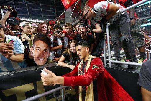 FILE - In this Sept. 20, 2017, file photo, Atlanta United midfielder Yamil Azad takes selfies with the crowd after he was named players of the match after an MLS soccer match against the LA Galaxy in Atlanta. Welcome to Atlanta, soccer's newest hotbed, which amazingly enough has sprouted up in a city known for its fickle sports fans and plenty of heartbreak from its teams. (Miguel Martinez/Atlanta Journal-Constitution via AP, File) The Associated Press