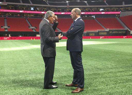 In this Oct. 23, 2017 photo, Atlanta United owner Arthur Blank, left, and Major League Soccer Commissioner Don Garber talk on the field at Mercedes-Benz Stadium in Atlanta, after Atlanta was chosen to host the 2018 MLS All-Star Game. Welcome to Atlanta, soccer's newest hotbed, which amazingly enough has sprouted up in a city known for its fickle sports fans and plenty of heartbreak from its teams. (AP Photo/Paul Newberry) The Associated Press