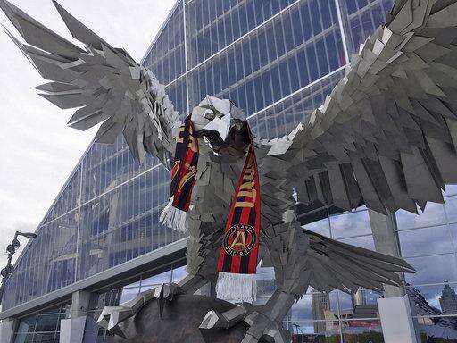 In this Oct. 22, 2017 photo, an Atlanta United scarf hangs from an Atlanta Falcons sculpture located outside Mercedes-Benz Stadium in Atlanta. United drew a record 71,874 for its final regular-season game and set a Major League Soccer season mark by averaging 48,200 per game in their inaugural year.(AP Photo/Paul Newberry) The Associated Press