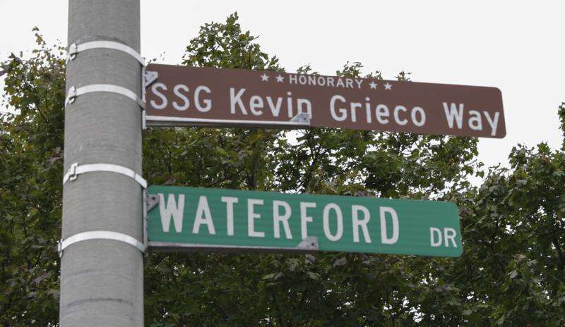 The honorary sign, which has white letters on a brown background reading "SSG Kevin Grieco Way," is positioned above the existing Waterford sign near his parents' house. Ralph and Linda Grieco can see it from their backyard.