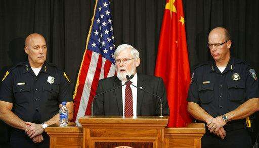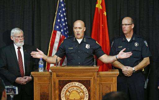 University of Utah President David W. Pershing, center, speaks to reporters as Salt Lake City Police Chief Mike Brown, left, and University of Utah Police Chief Dale Brophy, look on during a news conference Tuesday, Oct. 31, 2017, in Salt Lake City. A fatal carjacking attempt near the University of Utah late Monday left one student dead and touched off a campus-wide lockdown as hundreds of police officers swarmed buildings and nearby foothills and canyons in search of the suspected gunman. (AP Photo/Rick Bowmer)
