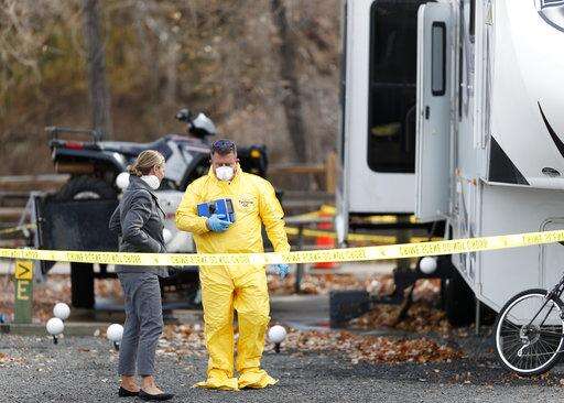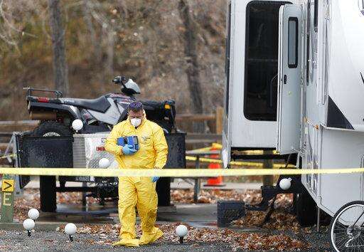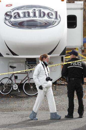 An investigator walks past a police officer standing guard outside a trailer in a park along Clear Creek in which the body of a 63-year-old man was found, Tuesday, Oct. 31, 2017, in Golden, Colo. Police say that a man arrested in a fatal carjacking near the University of Utah is wanted for questioning in the death of the man in Golden. (AP Photo/David Zalubowski)
