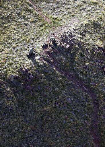 A pair of officers sit on a hillside with spotting scopes as law enforcement continue their search for suspected murderer Austin Boutain in the mountains above the Red Butte Gardens and University of Utah Medical Center on Tuesday, Oct. 31, 2017.. (Scott G Winteron/The Deseret News via AP)