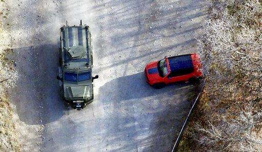 A Law enforcement vehicle passes what is believed to be victim ChenWei Guo's car as they the continue their search for suspected murderer Austin Boutain in the mountains above the Red Butte Gardens and University of Utah Medical Center on Tuesday, Oct. 31, 2017. (Scott G Winteron/The Deseret News via AP)