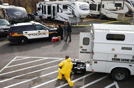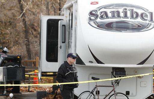 Investigators confer near a trailer in a park along Clear Creek in Golden, Colo., in which the body of a 63-year-old man was found Tuesday, Oct. 31, 2017. Police say that a man arrested Tuesday, Oct. 31, 2017 in a fatal carjacking near the University of Utah in Salt Lake City is wanted for questioning in the death of the man in Golden. (AP Photo/David Zalubowski)