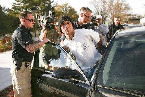 Austin Boutain, a suspect in Monday night's fatal shooting of University of Utah student ChenWei Guo, is led out of the University of Utah Department of Public Safety in Salt Lake City, Tuesday, Oct. 31, 2017. Boutain surrendered to police in Salt Lake City on Tuesday after a manhunt in the foothills near the University of Utah campus. Golden police say he's a person of interest in 63-year-old Mitchell Bradford Ingle's death. (Spenser Heaps/The Deseret News via AP)