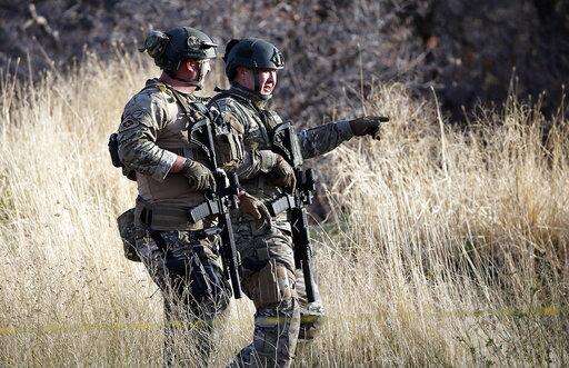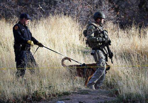 Law enforcement search of the hills near the mouth of Red Butte Canyon, Tuesday, Oct. 31, 2017, in Salt Lake City. A fatal carjacking attempt near the University of Utah late Monday left one student dead and touched off a campus-wide lockdown as hundreds of police officers swarmed buildings and nearby foothills and canyons in search of the suspected gunman. (AP Photo/Rick Bowmer)