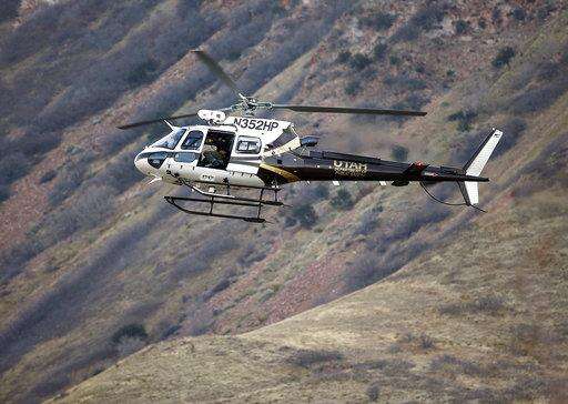 Law enforcement officials in a in a helicopter comb the hills near the mouth of Red Butte Canyon in Salt Lake City on Tuesday, Oct. 31, 2017, in search of the gunman responsible for the shooting a University of Utah student during a fatal carjacking attempt near the University of Utah late Monday. (Ravell Call/The Deseret News via AP)