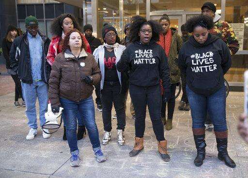 About two dozen people stand in front of the City-County Building in Indianapolis, Tuesday, Oct. 31, 2017, after the announcement that no charges would be filed against Indianapolis Metropolitan Police Department officers Michal P. Dinnsen and Carlton J. Howard who fired their weapons at Aaron Bailey, resulting in his death on a traffic stop earlier this past summer. (Robert Scheer/The Indianapolis Star via AP)
