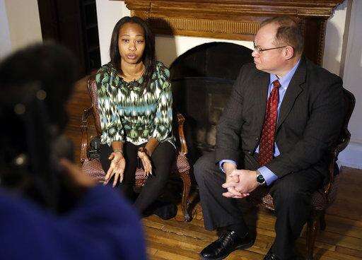 Erica Bailey, left, daughter of Aaron Bailey, speaks during a news conference, Tuesday, Oct. 31, 2017, in Indianapolis. Two Indianapolis police officers won't face criminal charges for the June shooting death of Aaron Bailey, who crashed his car while fleeing from a traffic stop, a special prosecutor announced Tuesday. Attorney Craig Karpe listens during the news conference. (AP Photo/Darron Cummings)