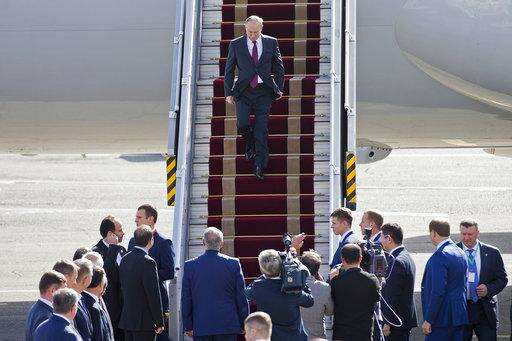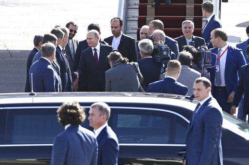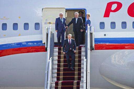 Russian President Vladimir Putin steps down from his plane on his arrival to Mehrabad Airport, in Tehran, Iran, Wednesday, Nov. 1, 2017. Putin arrived in Iran for trilateral talks with Tehran and Azerbaijan. (AP Photo/Ebrahim Noroozi)