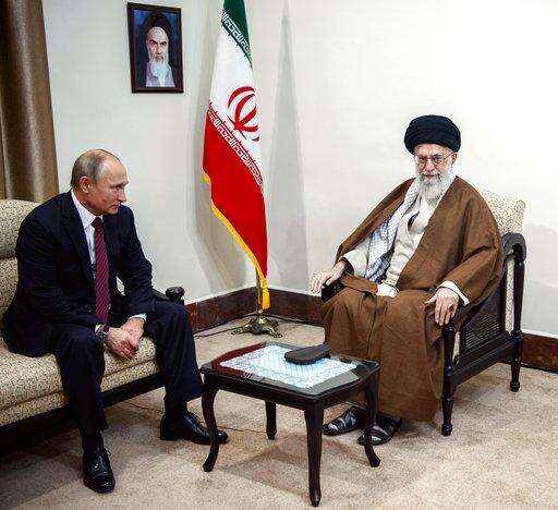 In this picture released by the office of the Iranian supreme leader, Supreme Leader Ayatollah Ali Khamenei, right, speaks with Russian President Vladimir Putin during their meeting in Tehran, Iran, Wednesday, Nov. 1, 2017. Putin arrived Wednesday for trilateral talks with Tehran and Azerbaijan, a meeting that comes as the Islamic Republic's nuclear deal is threatened by U.S. President Donald Trump's refusal to re-certify the accord. (Office of the Iranian Supreme Leader via AP)