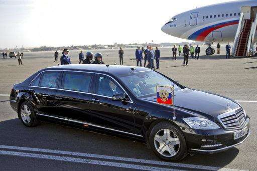 Russian President Vladimir Putin sits in the back seat of his limousine, on his arrival to Mehrabad Airport, in Tehran, Iran, Wednesday, Nov. 1, 2017. Putin arrived in Iran for trilateral talks with Tehran and Azerbaijan. (AP Photo/Ebrahim Noroozi)