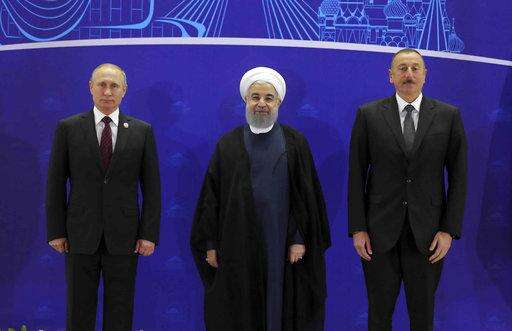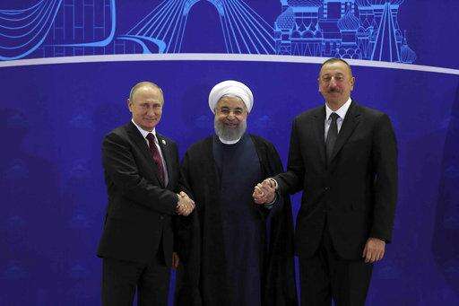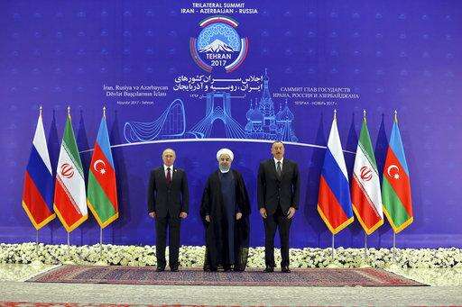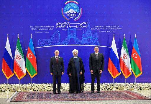 In this photo released by an official website of the office of the Iranian Presidency, Iranian President Hassan Rouhani, center, Russian President Vladimir Putin, left, and Azerbaijan's President Ilham Aliyev, pose for a photograph prior to their trilateral meeting in Tehran, Iran, Wednesday, Nov. 1, 2017. Russian President Vladimir Putin, in Iran on Wednesday for trilateral talks with Tehran and Azerbaijan, offered his support to the Islamic Republic's nuclear deal under threat by President Donald Trump's refusal to re-certify the accord. (Iranian Presidency Office via AP)