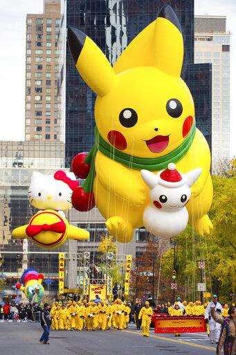 FILE - In this Nov. 24, 2016 file photo, a Pikachu balloon is seen on 59th Street during the Macy's Thanksgiving Day Parade in New York. Smokey Robinson, Jimmy Fallon, The Roots, Common and Andra Day will be among the stars celebrating at the upcoming Macy's Thanksgiving Day Parade in New York City. Macy's said Wednesday, Nov. 1, 2017, that Tony winner Leslie Odom Jr., 98 Degrees, Flo Rida, Wyclef Jean and Miss America Cara Mund also will participate in the 91st annual parade on Nov. 23. (Photo by Scott Roth/Invision/AP, file)