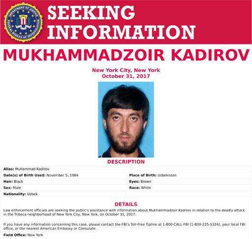 The poster says he was born in Uzbekistan. So was 29-year-old Sayfullo Saipov, who was charged Wednesday with providing material support to a terrorist group and violence and destruction of motor vehicles. Authorities say he drove the truck down the path intentionally, killing eight people. Investigators recovered a cellphone that had Islamic State group propaganda.