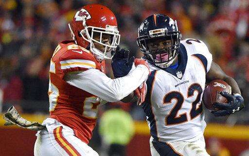Denver Broncos running back C.J. Anderson (22) is tackled by Kansas City Chiefs defensive back Kenneth Acker (25) during the second half of an NFL football game in Kansas City, Mo., Monday, Oct. 30, 2017. (AP Photo/Ed Zurga) The Associated Press