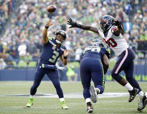 Seattle Seahawks quarterback Russell Wilson (3) passes under pressure from Houston Texans outside linebacker Jadeveon Clowney (90) in the second half of an NFL football game, Sunday, Oct. 29, 2017, in Seattle. (AP Photo/Elaine Thompson) The Associated Press