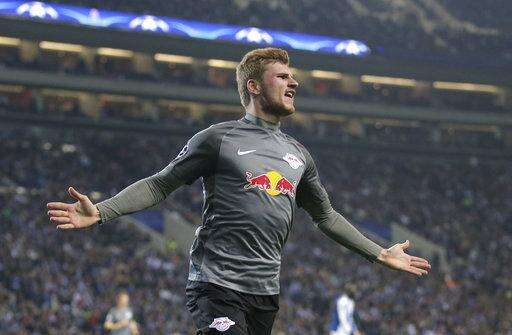 Leipzig's Timo Werner celebrates after scoring his side's first goal during the Champions League group G soccer match between FC Porto and RB Leipzig at the Dragao stadium in Porto, Portugal, Wednesday, Nov. 1, 2017. (AP Photo/Luis Vieira)