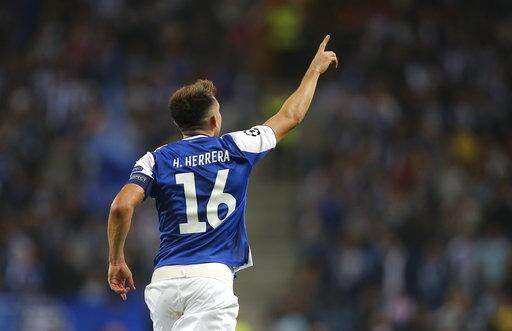 Porto's Hector Herrera celebrates after scoring the opening goal during the Champions League group G soccer match between FC Porto and RB Leipzig at the Dragao stadium in Porto, Portugal, Wednesday, Nov. 1, 2017. (AP Photo/Luis Vieira)