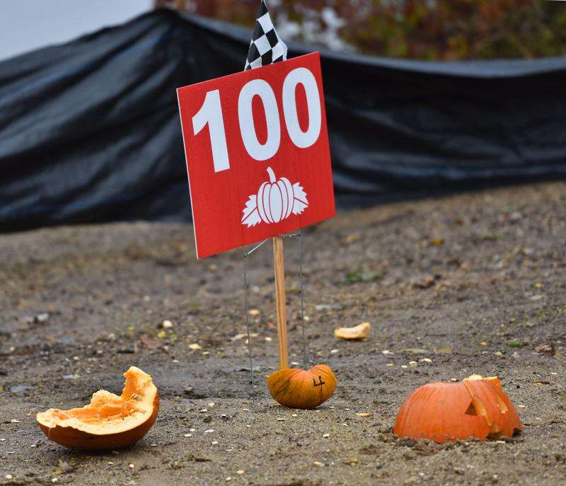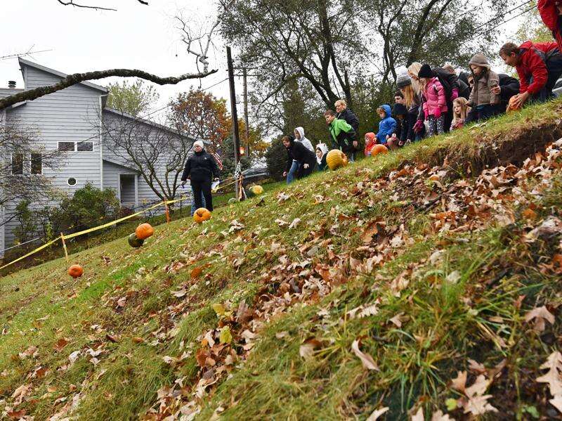 Pumpkins are rolled down the steep hill at Butch Hagele Beach in Lake in the Hills Saturday. John Starks/jstarks@dailyherald.com
